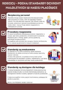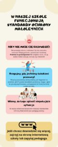 - Wersja skrócona Standardów (dla małoletnich) dostępna jest na tablicy ogłoszeń w pokoju nauczycielskim, w gabinecie pedagoga i psychologa szkolnego oraz w internacie.